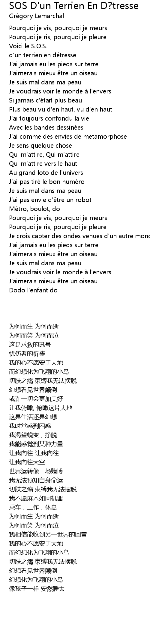 Pourquoi je vis, pourquoi je meurs pourquoi je ris, pourquoi je pleure voici le sos d'un terrien en detresse j'ai jamais eu les pieds sur terre j'aim'rais mieux etre un oiseau j'suis mal dans ma peau j'voudrais voir. D'un terrien en détresse j'ai jamais eu les pieds sur terre j'aim'rais mieux être un oiseau j'suis mal dans ma peau. S o s d un terrien en de tresse daniel balavoine cover alessandra scalabrin.mp3.